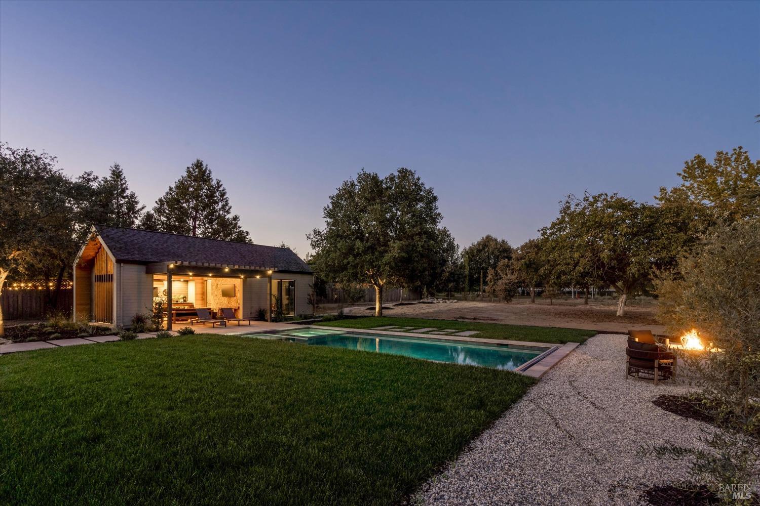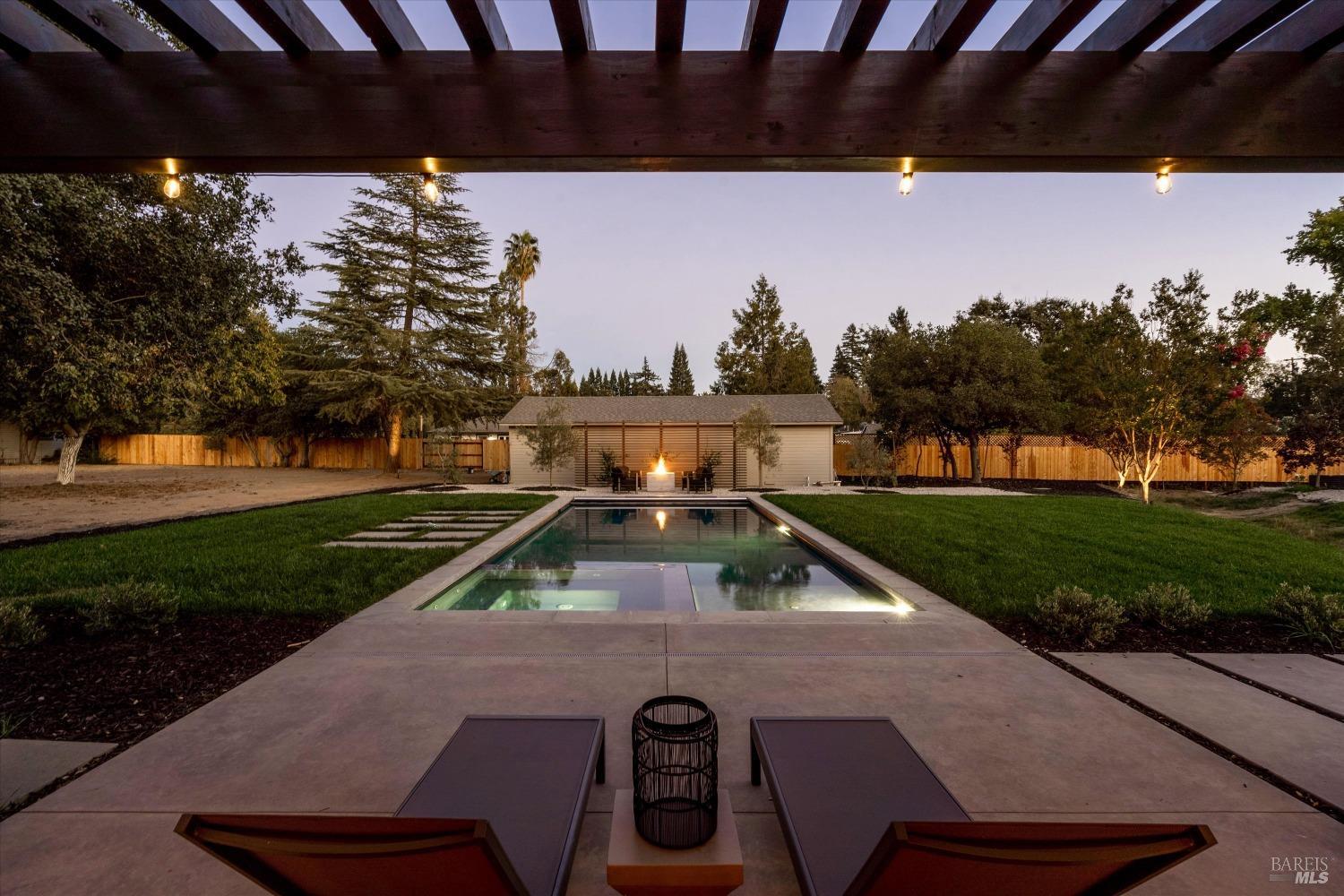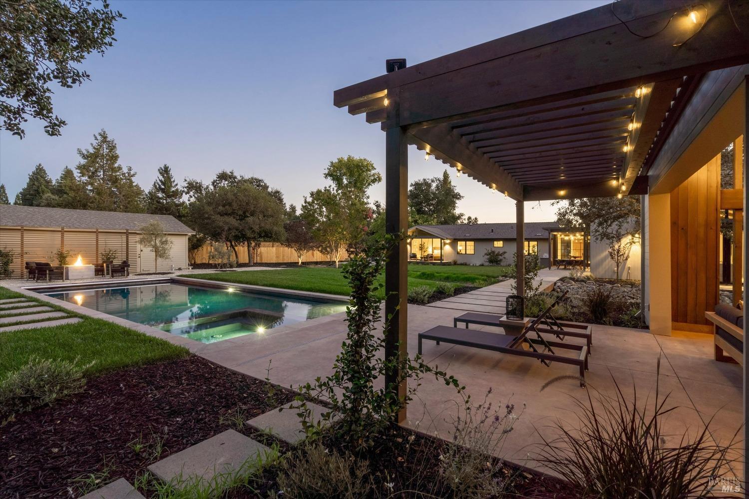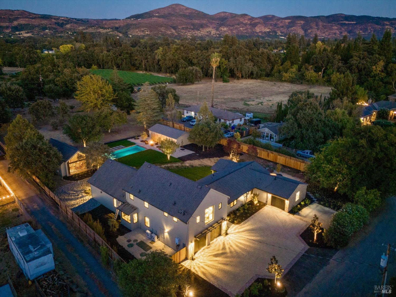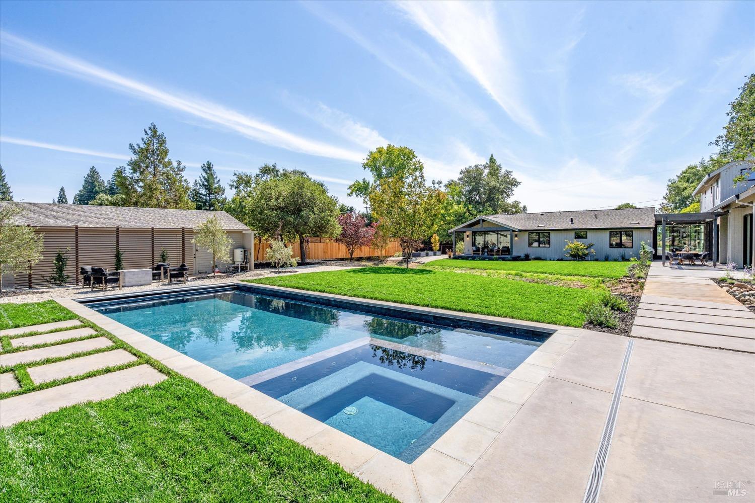 Modern Luxury in Napa's Wine Country Located at 1574 McKinley Rd, this 4-bedroom, 4.5-bathroom home offers modern comfort and tranquility just minutes from downtown Napa. The main level includes a spacious primary suite with a walk-in closet, heated marble floors, and a soaking tub, plus two additional bedrooms with en-suite bathrooms. Upstairs features a family/media room and a fourth en-suite bedroom. The open-concept living area is perfect for entertaining with a gas fireplace and 230-bottle wine cellar. The gourmet kitchen includes a 48" range with griddle, custom brass range hood, and a butler's pantry. The expansive acre-plus outdoor space offers potential for a sports court, micro farm, or vines. It includes a one-car & two-car garage attached to the main house, plus a detached two-car garage workshop with rear driveway access. For relaxation, enjoy the heated pool with an 8-person spa and automated cover. A nearby pavilion features a full bathroom, exercise room, and outdoor kitchen with a 36" Artisan grill and beverage dispenser. The pavilion's bathroom includes a shower with direct pool access, providing convenience and comfort. This property is a blend of modern luxury and serene country living in the heart of Napa Valley.