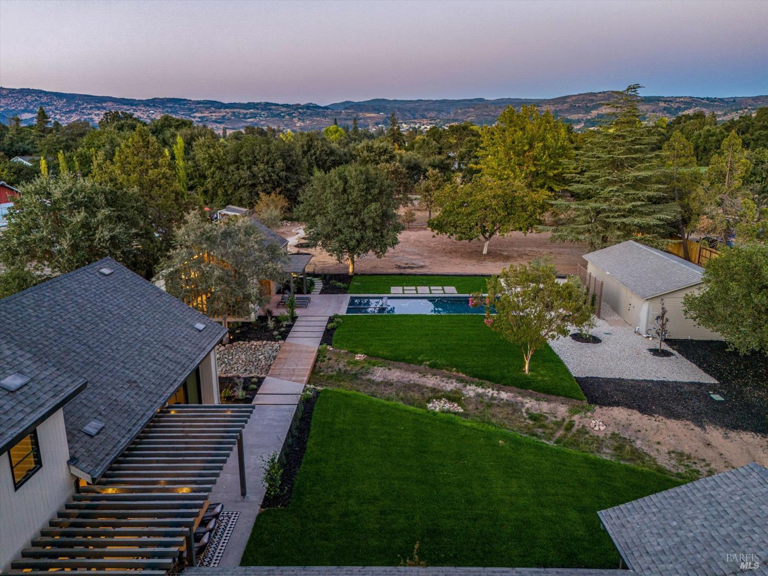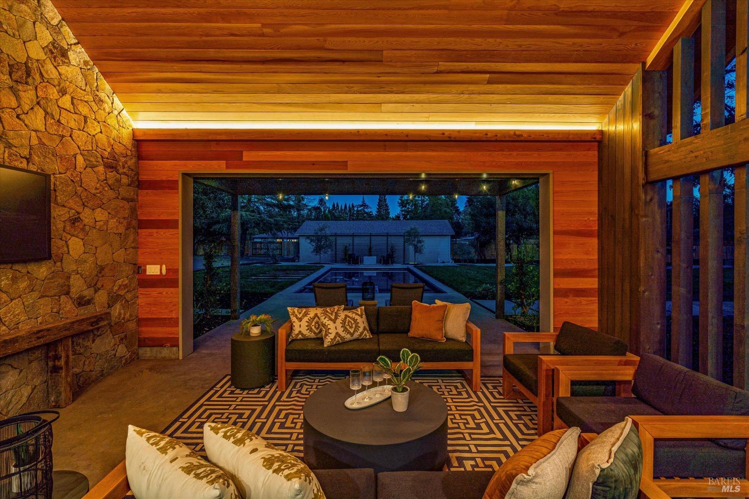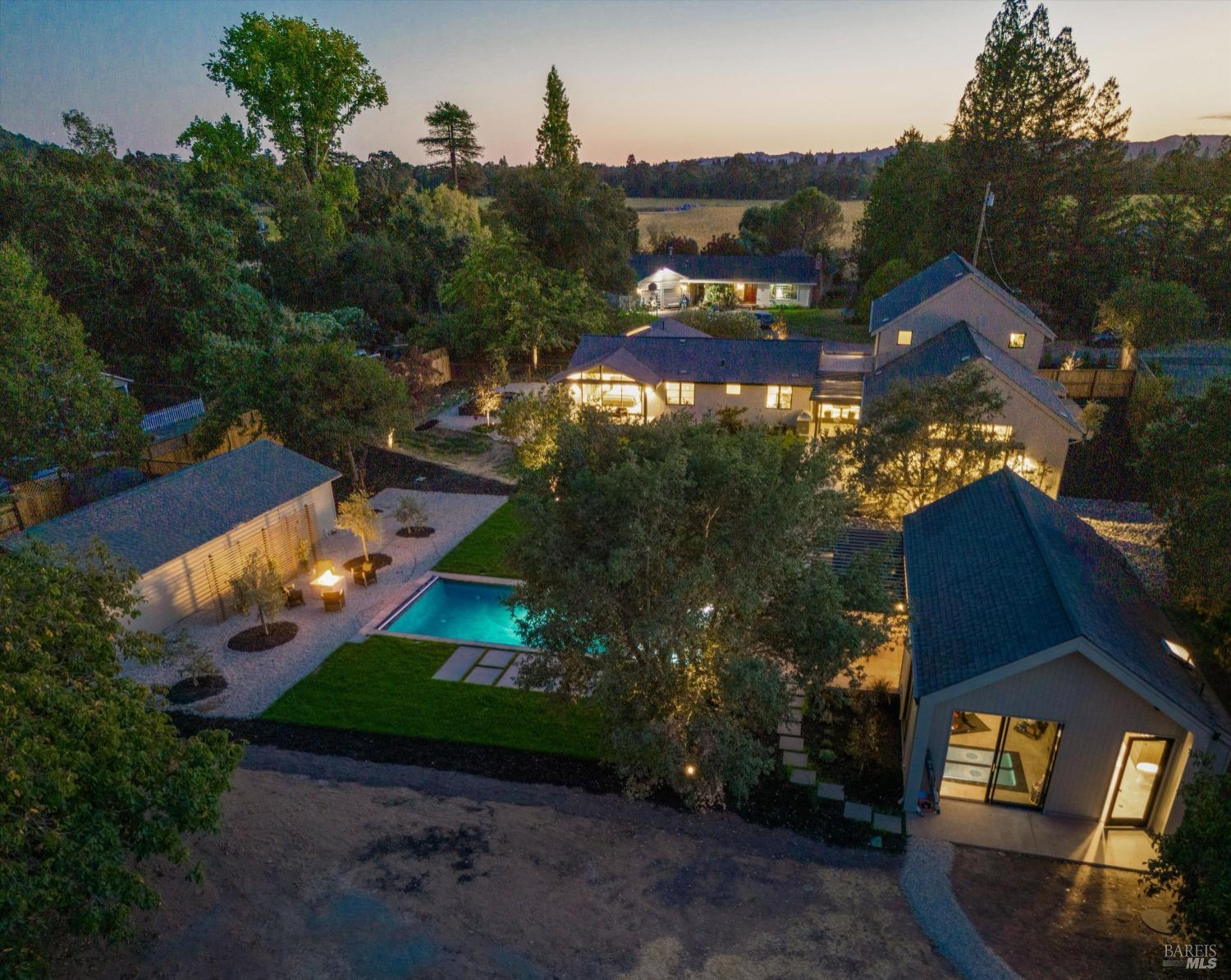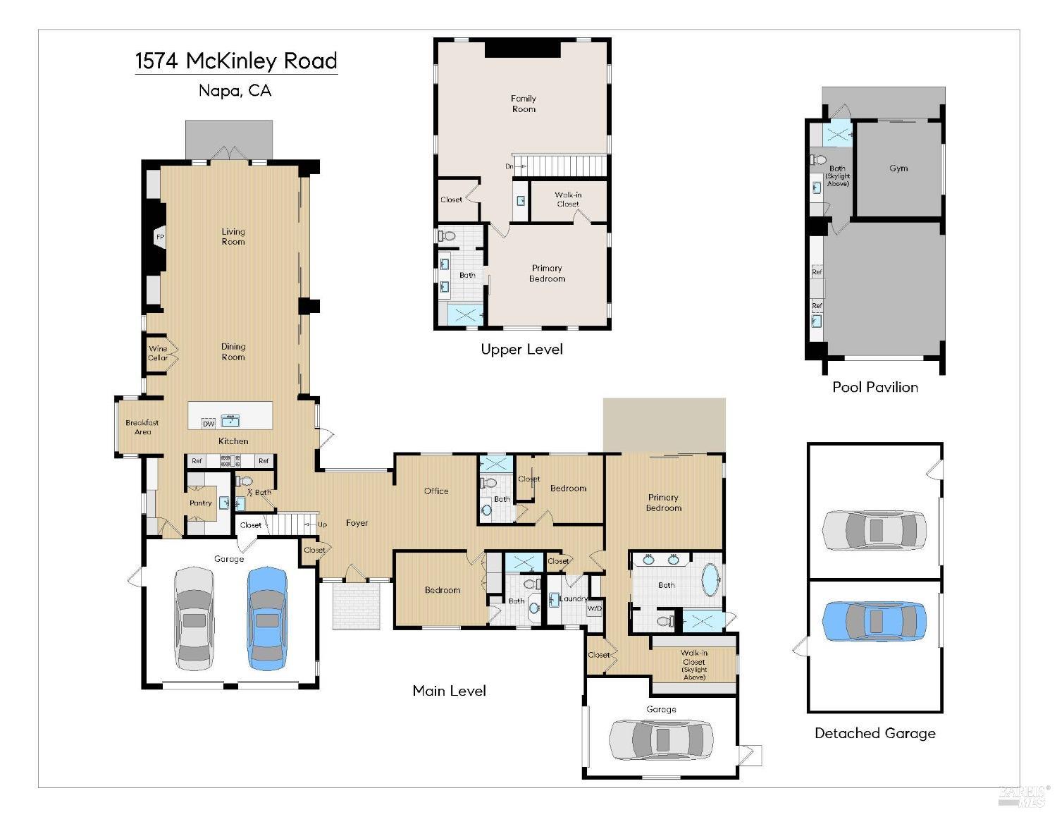 Modern Luxury in Napa's Wine Country Located at 1574 McKinley Rd, this 4-bedroom, 4.5-bathroom home offers modern comfort and tranquility just minutes from downtown Napa. The main level includes a spacious primary suite with a walk-in closet, heated marble floors, and a soaking tub, plus two additional bedrooms with en-suite bathrooms. Upstairs features a family/media room and a fourth en-suite bedroom. The open-concept living area is perfect for entertaining with a gas fireplace and 230-bottle wine cellar. The gourmet kitchen includes a 48" range with griddle, custom brass range hood, and a butler's pantry. The expansive acre-plus outdoor space offers potential for a sports court, micro farm, or vines. It includes a one-car & two-car garage attached to the main house, plus a detached two-car garage workshop with rear driveway access. For relaxation, enjoy the heated pool with an 8-person spa and automated cover. A nearby pavilion features a full bathroom, exercise room, and outdoor kitchen with a 36" Artisan grill and beverage dispenser. The pavilion's bathroom includes a shower with direct pool access, providing convenience and comfort. This property is a blend of modern luxury and serene country living in the heart of Napa Valley.